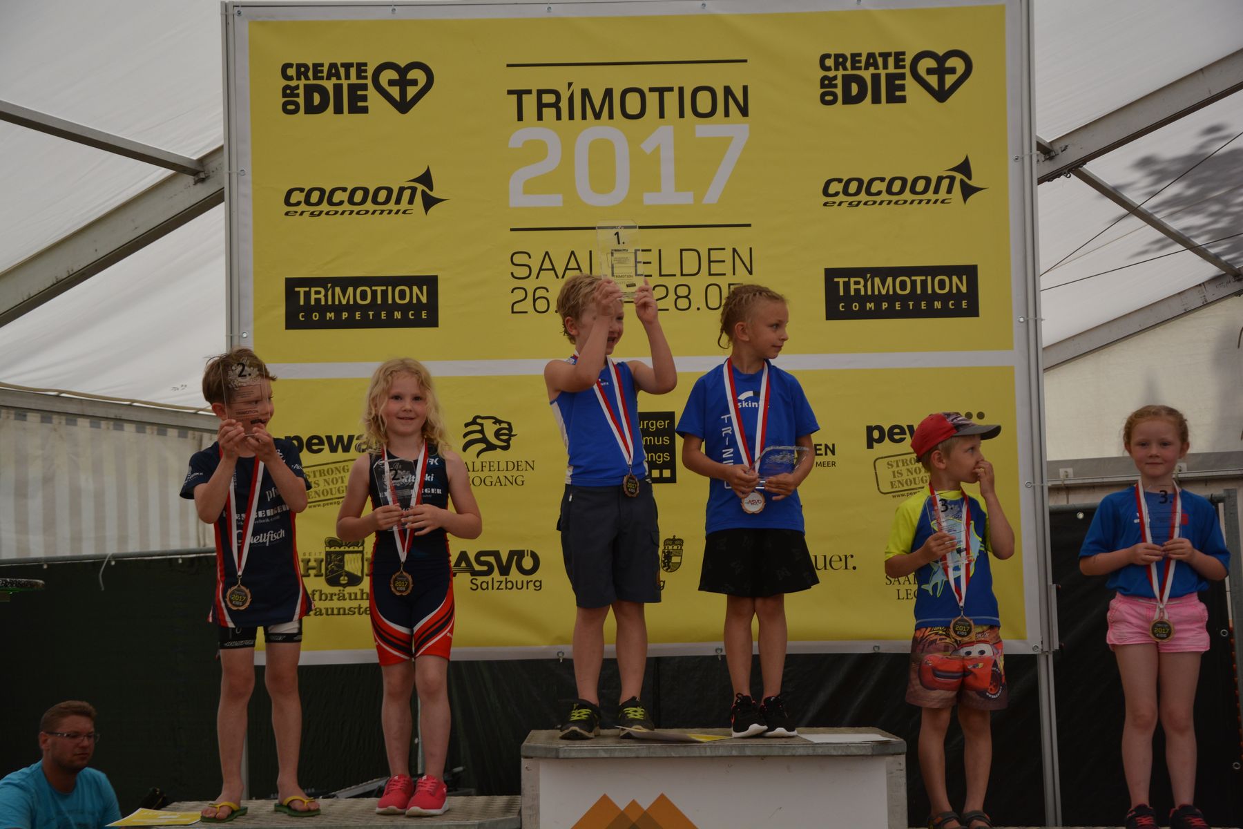 Am Sonntag Vormittag tat es dann eine große Abordnung der Tri Kids den Age Group Athleten gleich. Beim TRI Motion Kids Aquathlon in Saalfelden ließen sie die Salzburger Vereine alle hinter sich und brachten ganze 11 Stockerlplätze nach Tirol. Bei den Jüngsten erreichten Anna Rass und Laurenz Pernhofer den 2. Rang und Laura Berger stand bei ihrem ersten Aquathlon gleich mit Platz 3 am Stockerl. In der Klasse D gehören alle 3 Stockerlplätze den Kitzbühler Dirndln, Elisabeth Berger stand vor Nina Grüner und Melanie Jobst auf Platz 1. Bei den Burschen lieferten sich Thomas Rass und Maximilian Fuchs ein Verfolgungsrennen um die Plätze 1 und 2, bei dem Thomas dann über die Ziellinie die Nase vorn hatte. Lilly Fuchs finishte mit einem Start – Ziel Sieg bravourös, ihre Teamkollegin Viktoria Grüner holte sich die Bronze Medaille und Melanie Hamza Platz 5. Den letzten Stockerlplatz holte sich Vitus Joast, nach 400 m schwimmen kam er als zweiter Bursche aus dem Ritzensee und konnte diesen Platz bis ins Ziel halten. Pia Lorenzoni wurde sehr gute Vierte.