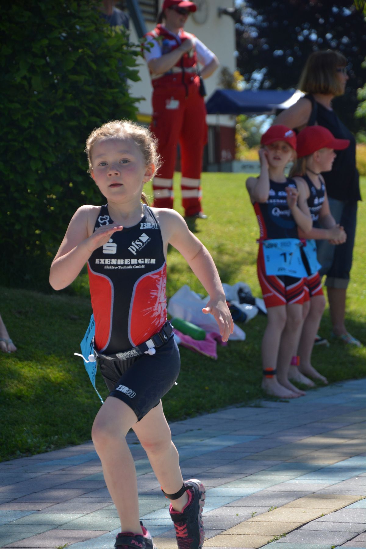 nach einer mißlungenen Wettkampfbesprechung gab es beim Schwimmen auf den 100 m schon eine Kollision um die erste Boje der 25 Starterinnen. Die jungen Triathletinnen ließen sich aber nicht beirren und beendeten alle wohlbehalten die Schwimmstrecke von 100m. Lilly Fuchs stieg als 8. aus dem Pool und konnte sich durch ihre hervorragende Rad Leistung nach der 2 km Strecke auf Platz 1 vorkämpfen. Sie konnte auch läuferisch das hohe Tempo halten und bei der Siegerehrung die begehrte Glastrophäe auf Platz 1 entgegennehmen. Viktoria Grüner, als jahrgangsjüngere, kämpfte tapfer mit und belegte