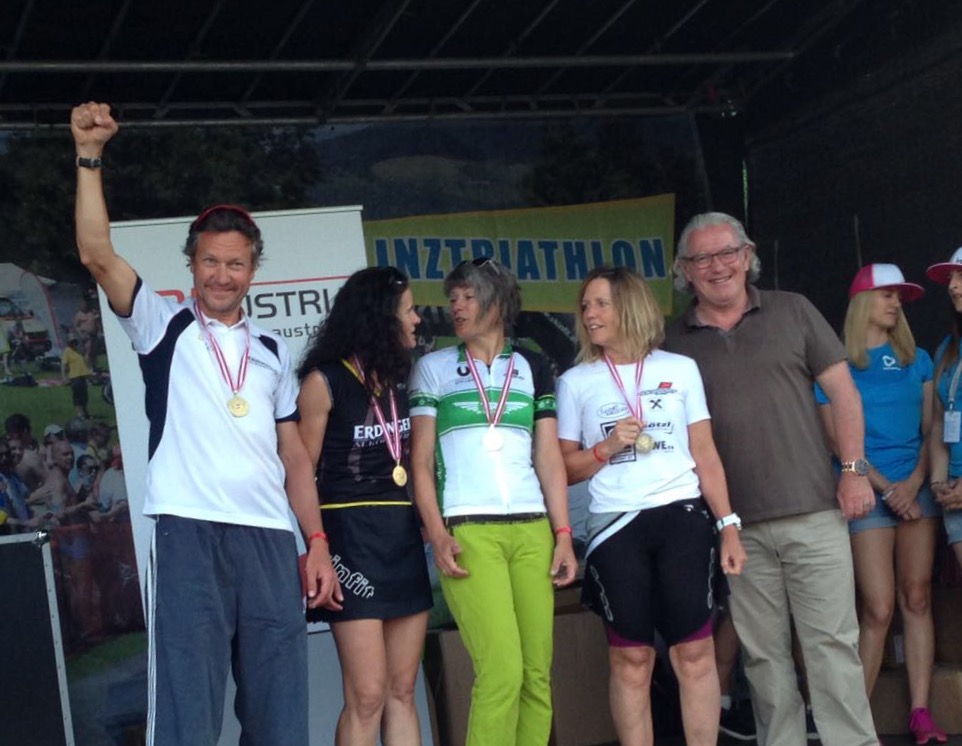 Zu Mittag startete der Mitteldistanz Bewerb. Peter Hechenberger kam im vorderen Feld aus dem Wasser und konnte sich auf der Radstrecke nach vorne arbeiten. Auf der Laufstrecke konnte er seine Erfahrung und seine Stärke ausspielen und ging mit einer Zeit von 4:30:44 als Österreichischer Meister in der Klasse M45 über die Ziellinie.